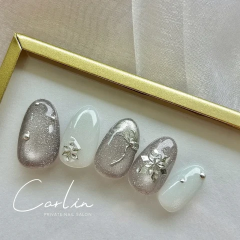 ミラーで描いたリボンネイルは、繊細ながらも光沢のおかげで目をひきます◎