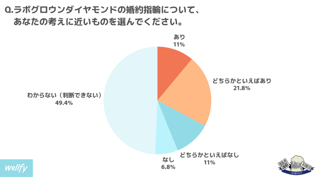 一方で「わからない(判断できない)」が49%と最多だったことから、まだまだラボグロウンダイヤモンドの認知度や情報の浸透に課題があることも見えてきます。