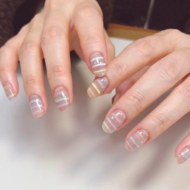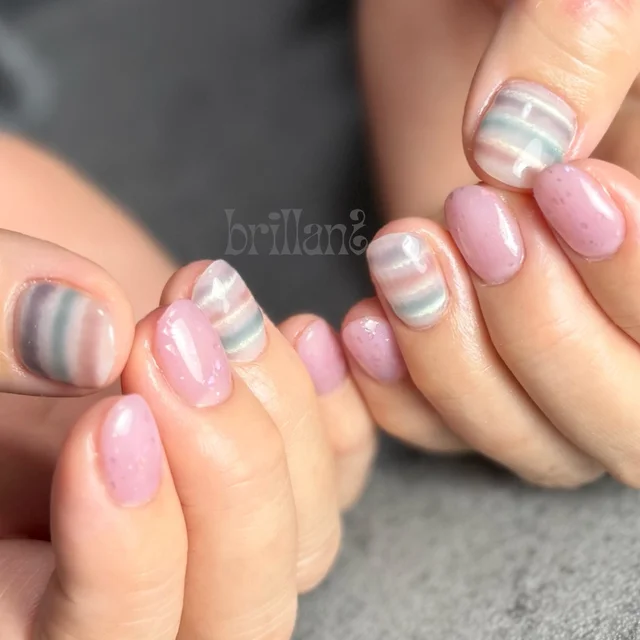 肌と調和する、柔らかいピンクのボーダーマグネットネイル♪