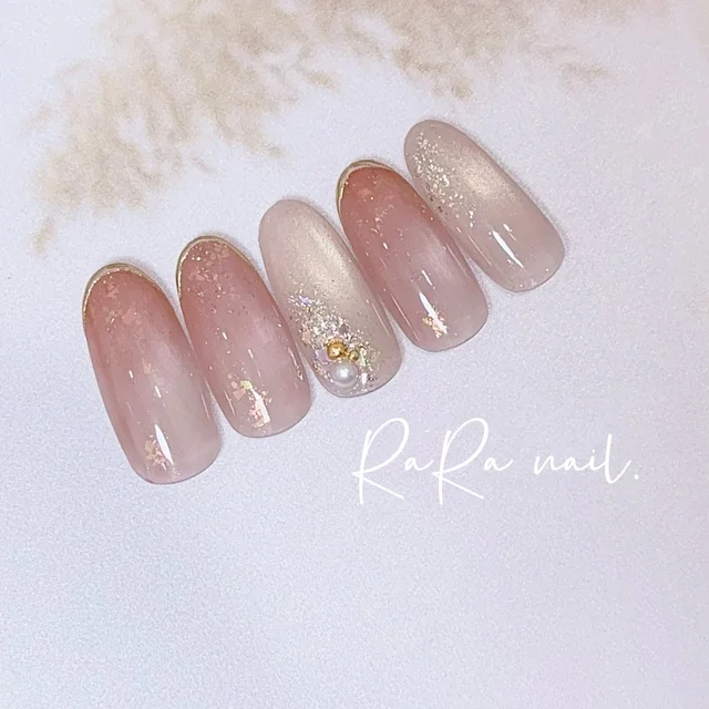 ラメは大粒と小粒をミックスして、控えめなボリュームのまま表情豊かに♪