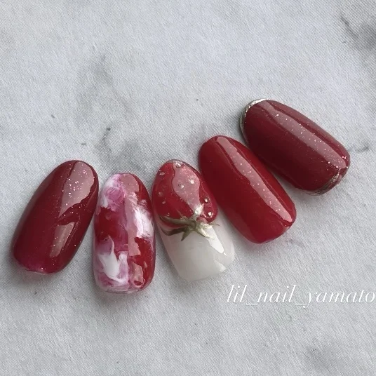 大小2種類のいちごを同時に載せたネイルデザイン♪