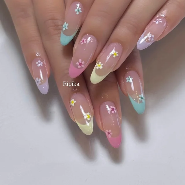 色とりどりのフレンチに合わせて、花を咲かせたキュートなネイルデザイン♪ 花芯も同系色の濃淡で表すと、洗練されたまとまりが生まれます。 ベースにシアーカラーを選び、余白を広く取ると、抜け感も抜群に◎