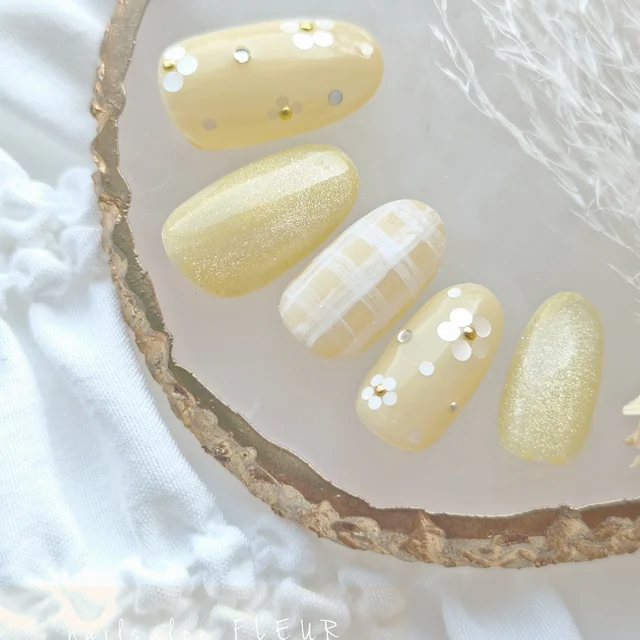 ハッピーなムードを醸すバターイエローに、柔らかく光るホログラムのフラワーネイル♡ ストーンやスタッズも添えると、春にふさわしいキラキラ感がアップします。 カジュアルなチェックは、イースターの飾り付けを連想させます♪