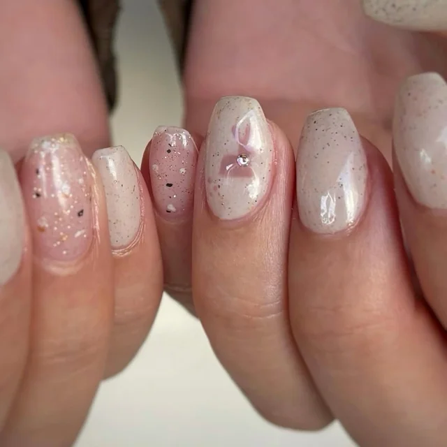 砂ジェルとラメが広がるベースに、小さなウサギがひっそり姿を見せるイースターネイル♡ やさしいコントラストで可愛さをうまく抑えれば、大人も使いやすい控えめなボリュームに。 クリアカラーの奥からは爪がのぞき、ナチュラルな素肌感も味わえます◎