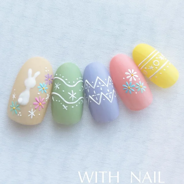 イースターの時期にぴったりな、春の定番パステルカラーのネイルデザイン♪ マットな質感は、本物のたまごを連想させます。 ウサギの後ろ姿以外は、ホワイトの精細なラインでまとめているので、爽やかな統一感がありますね◎