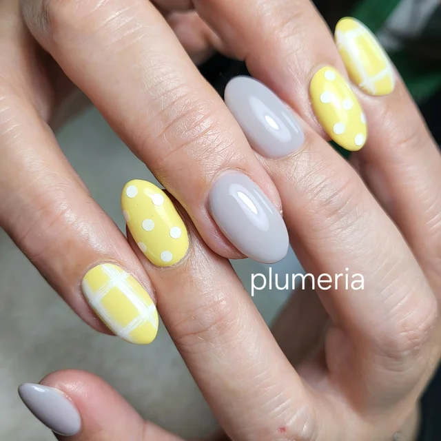 ポイントに入れたグレーが、大人の落ち着きを感じさせる配色のイースターネイル♡ 単体だとポップに見えるイエローに、アーバンなかっこよさがプラスされます。 イースターならではの楽しげな雰囲気は、チェックとドットでさらっと表して◎